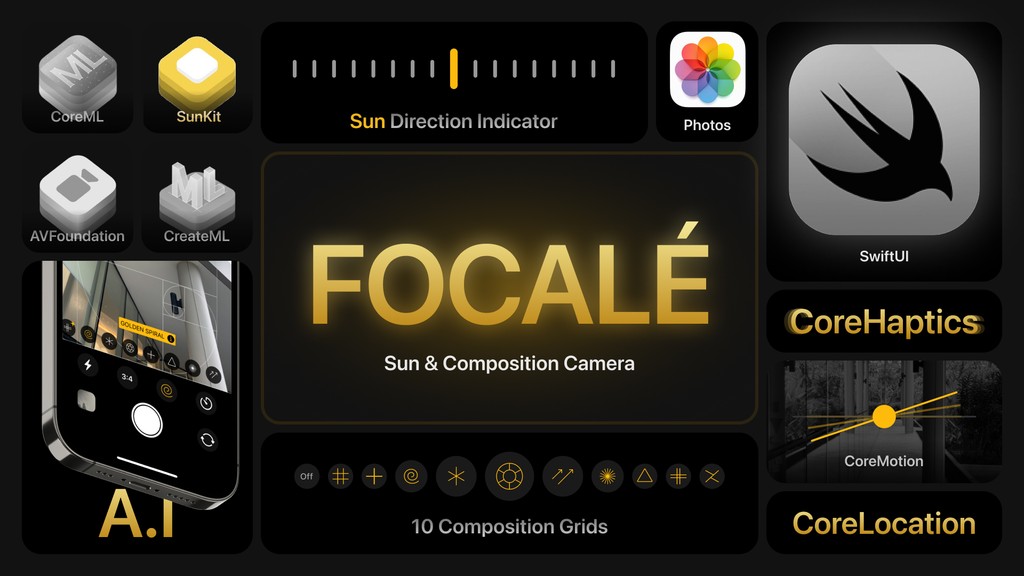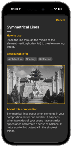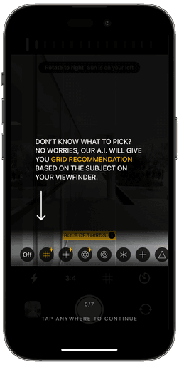 Leveraging the power of CoreML + CoreMotion, you'll be given composition recommendation ( * mark) based on the subject on your viewfinder.