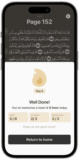 Monitor your daily memorization milestones with personalized "daily missions" that include ziyadah, murojaah, and rabt tasks.