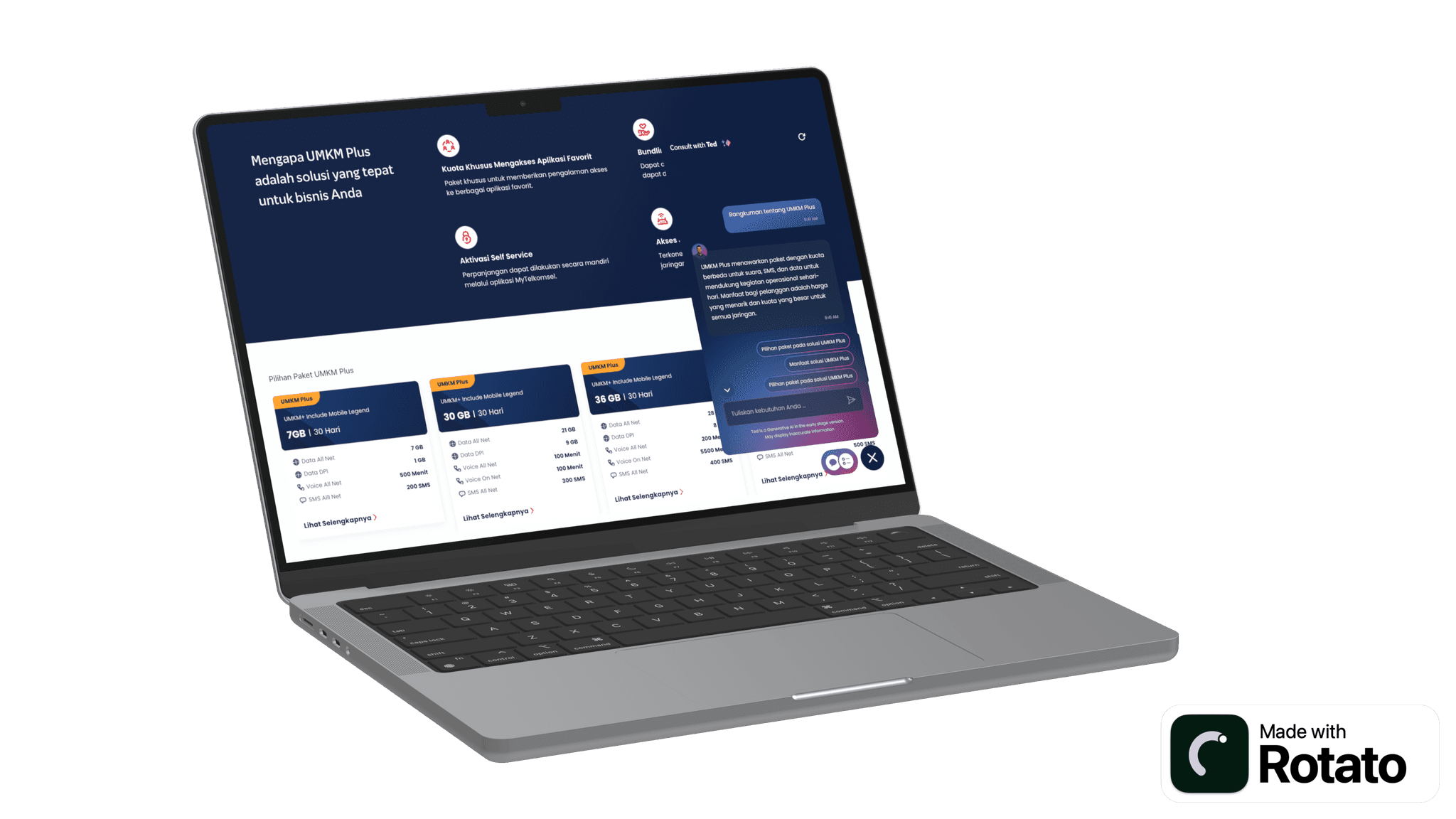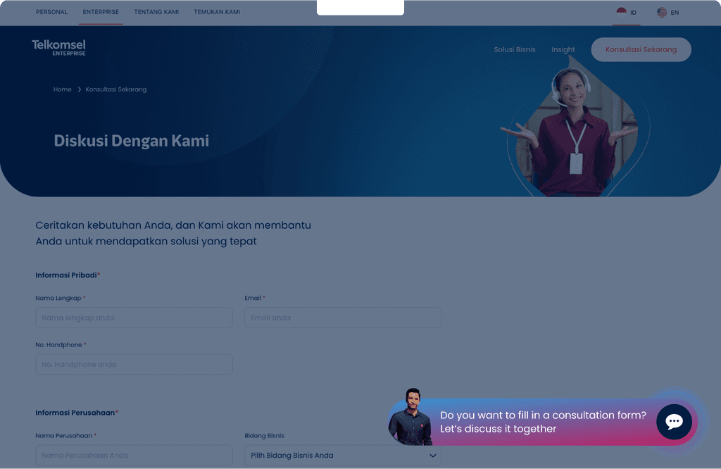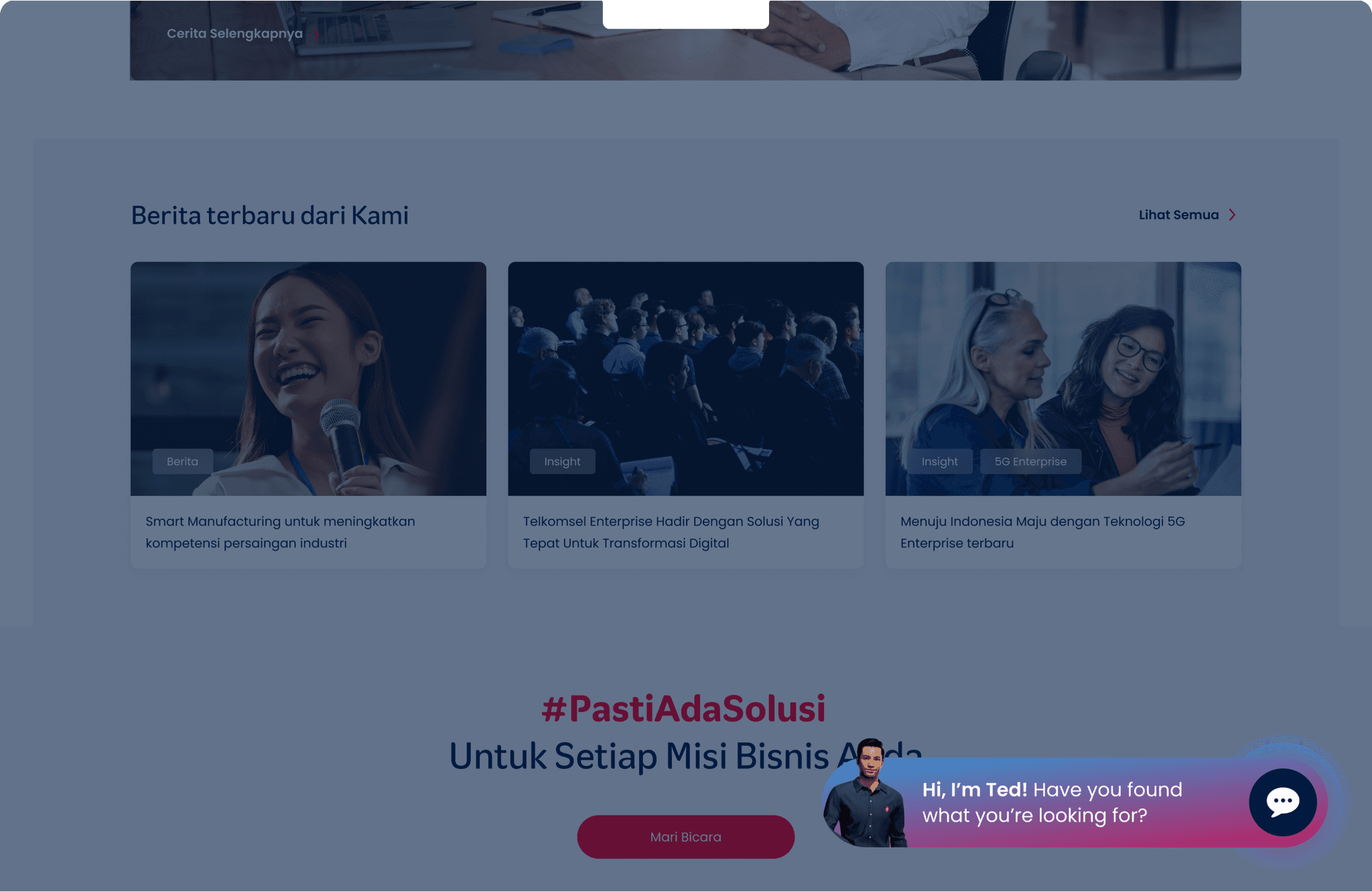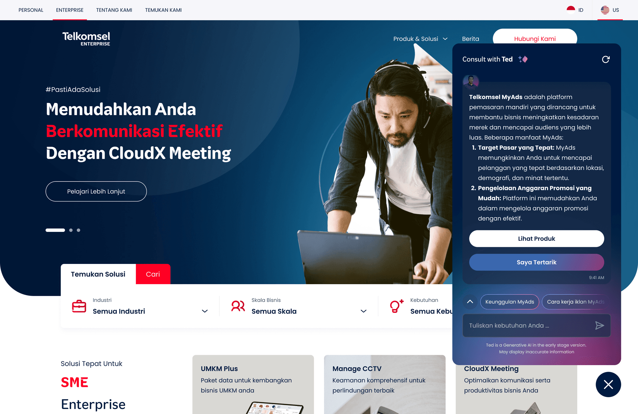 Powered by Artifical Intelligence technology, Ted is a chatbot present to help Telkomsel Enterprise customers find the right solutions to help their businesses grow.